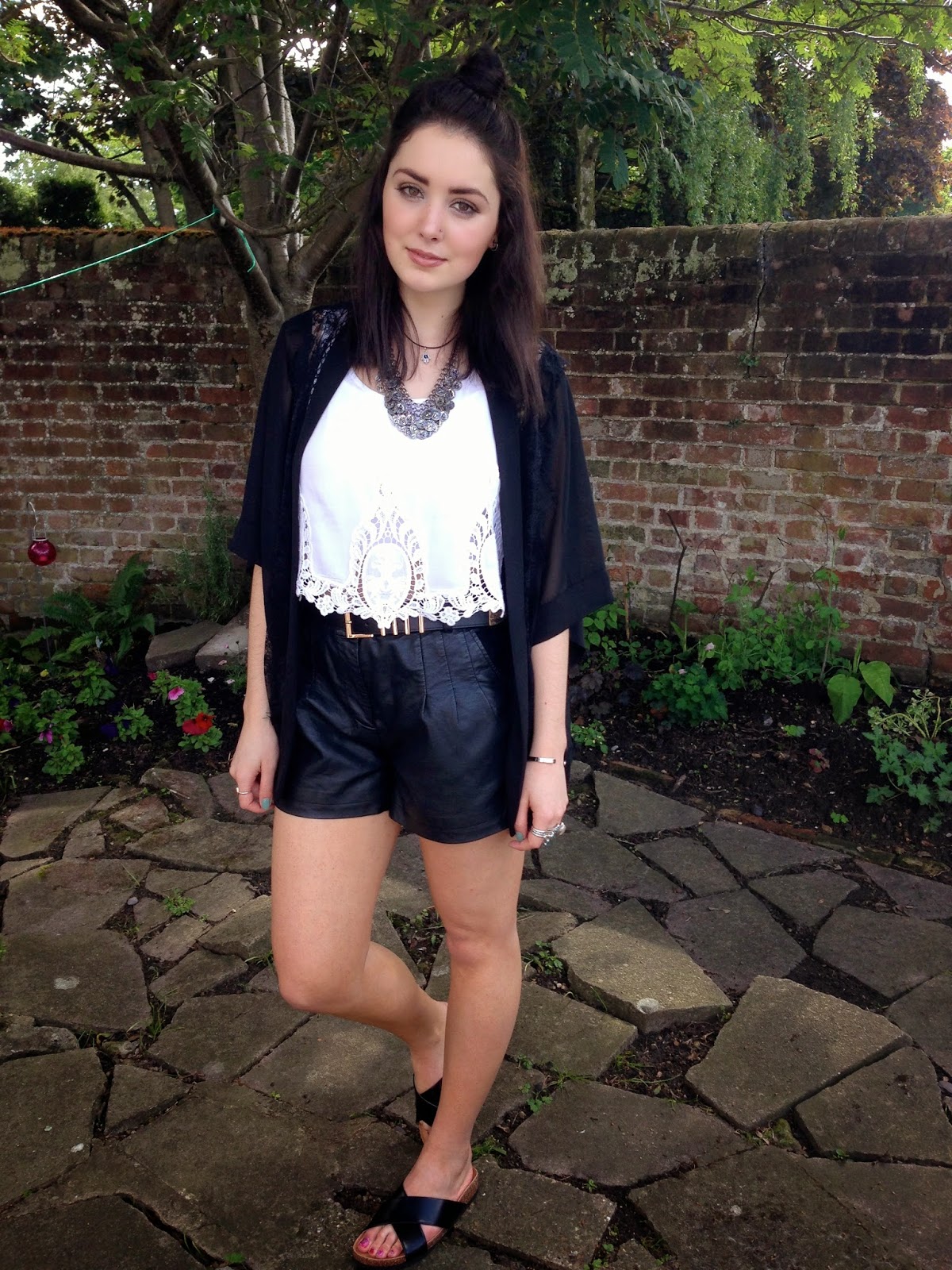 H&M crochet top, Topshop leather shorts, Primark kimono, H&M sliders